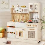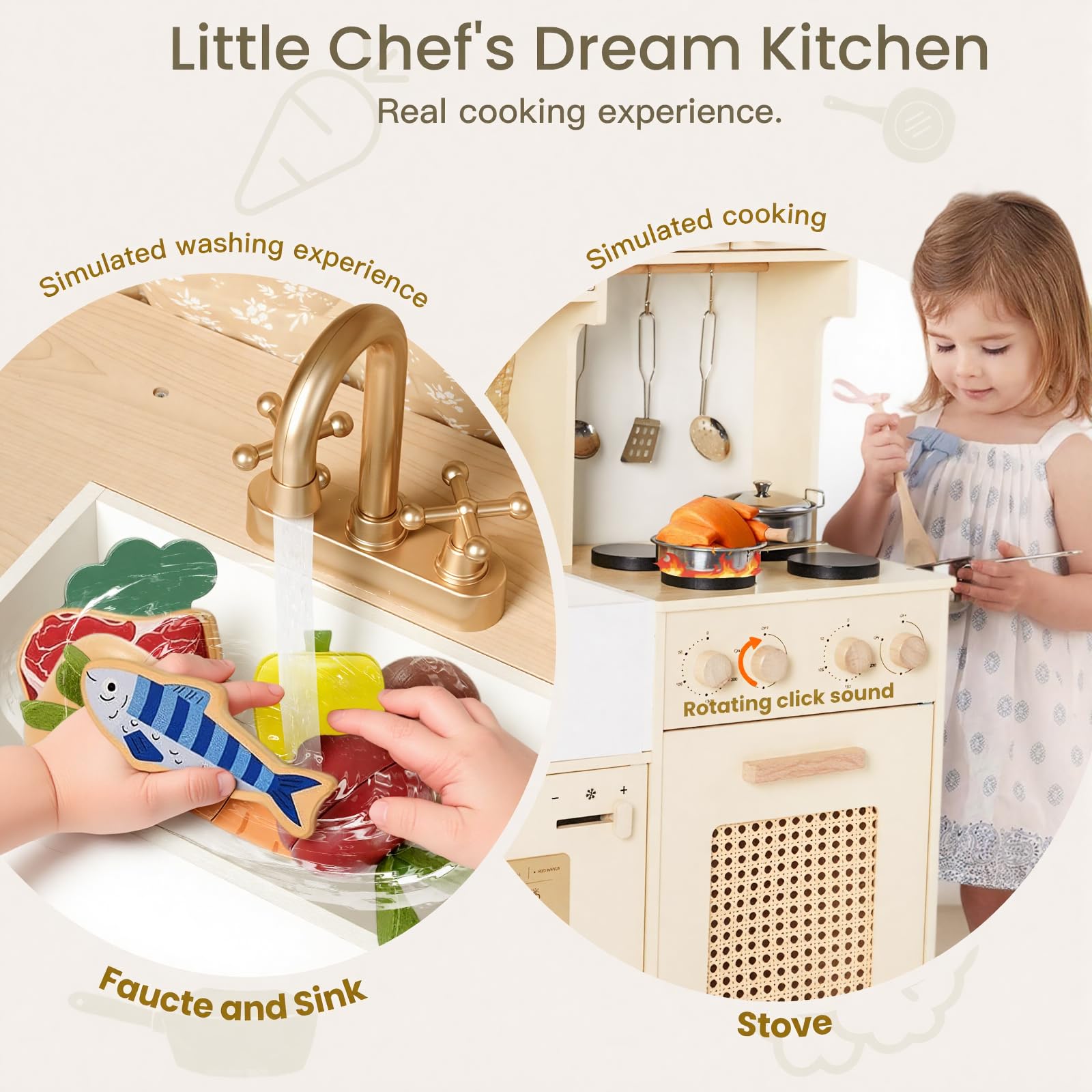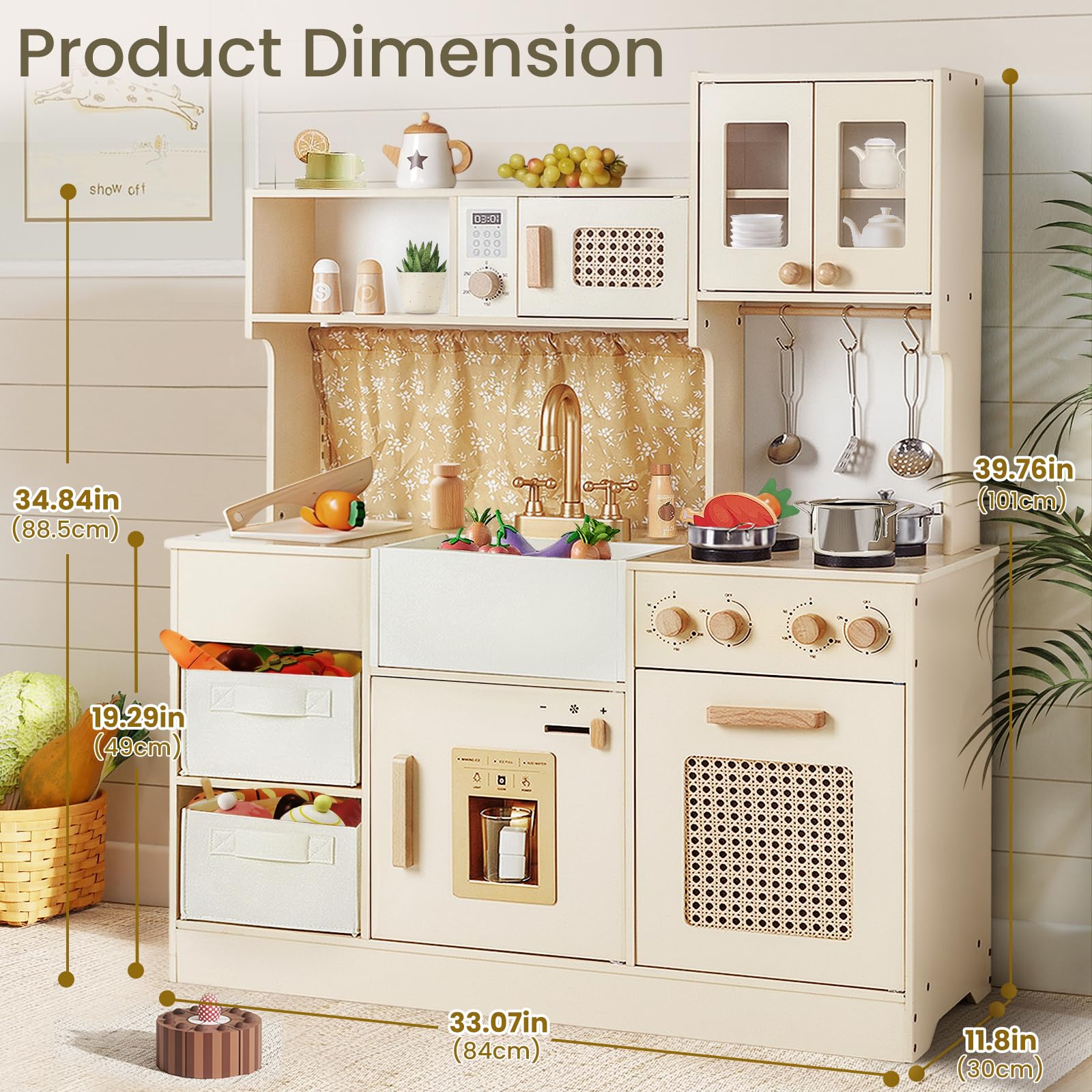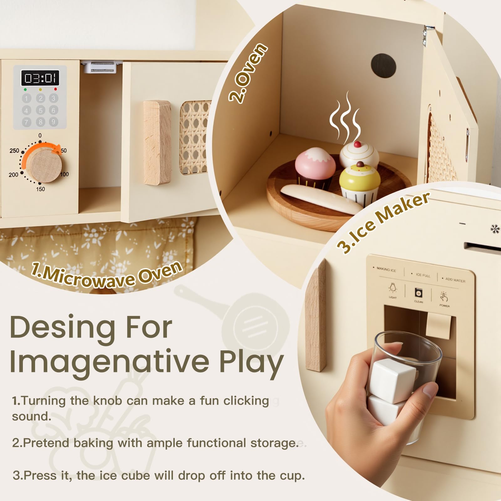 Elegant Montessori-inspired toy kitchen with stove, sink, and ice maker — designed for realistic cooking fun, imaginative play, and hands-on organization for kids ages 3+.
