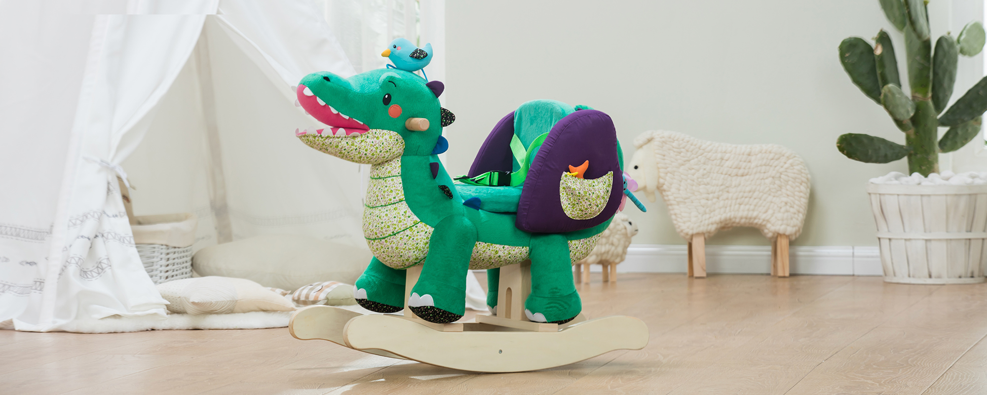 Plush crocodile rocker with playful hidden surprises — crinkle spines, rattle fish, and shiny dragonfly — huggable head, sturdy wooden base, and imaginative rocking fun toddlers 1–3Y will love.