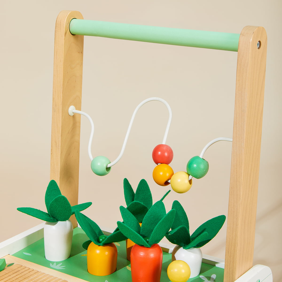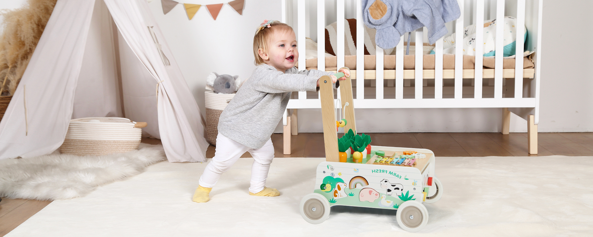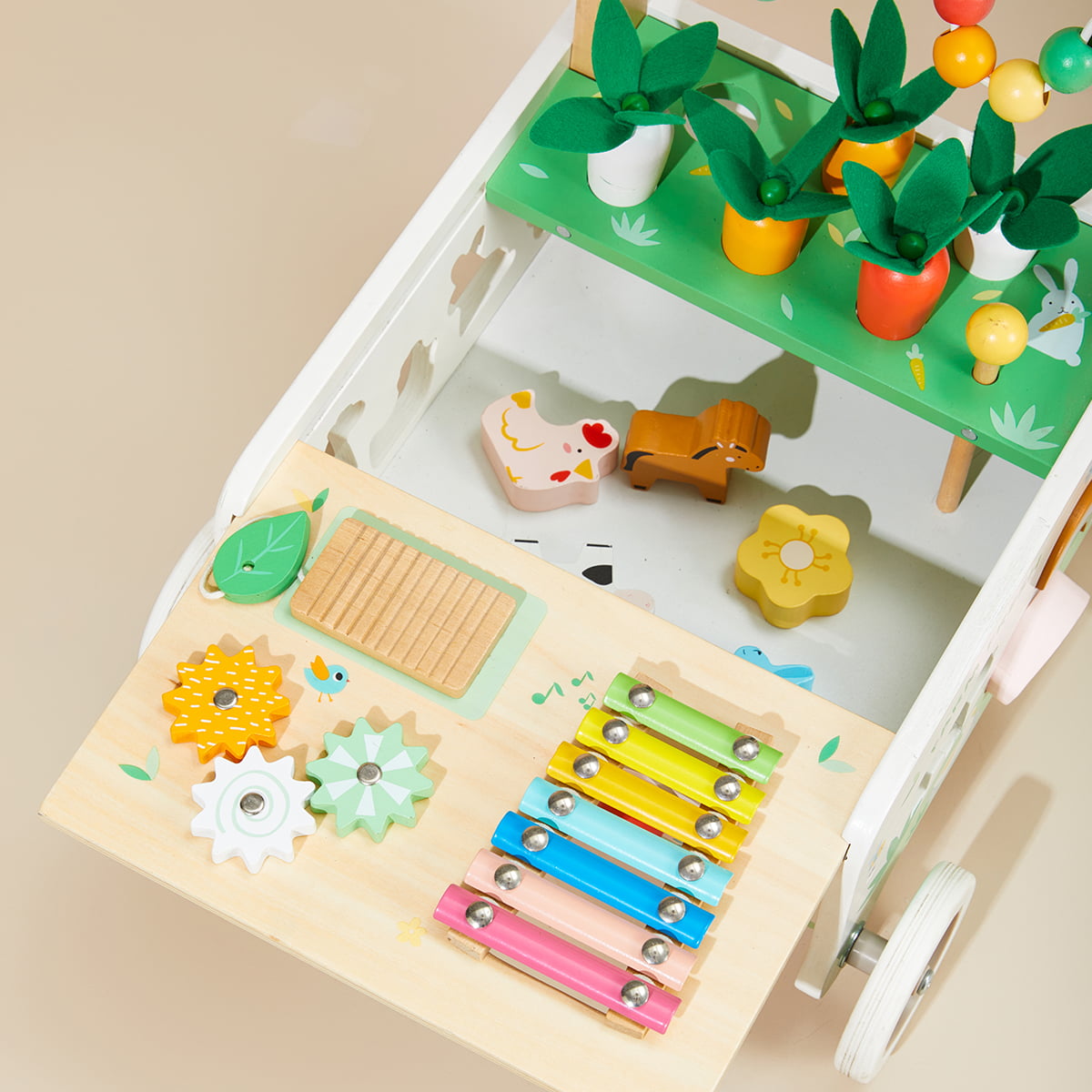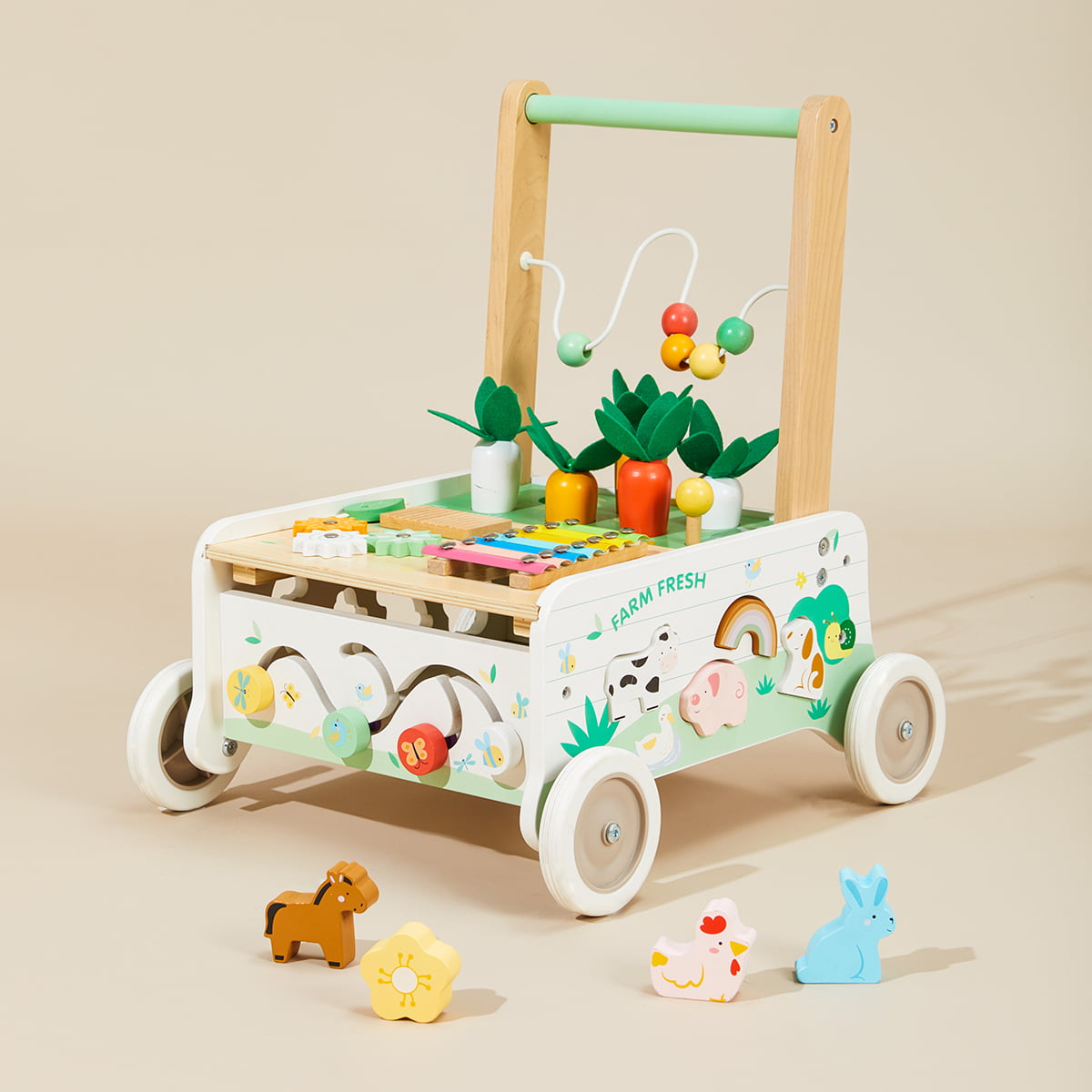 Wooden push walker with farm-inspired Montessori activities — carrot harvest, xylophone, and shape sorter — for toddlers 18M+.