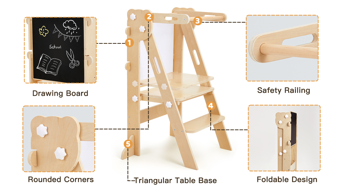 Foldable Learning Tower for Children, Montessori Learning Tower with Two-Sided Board.
