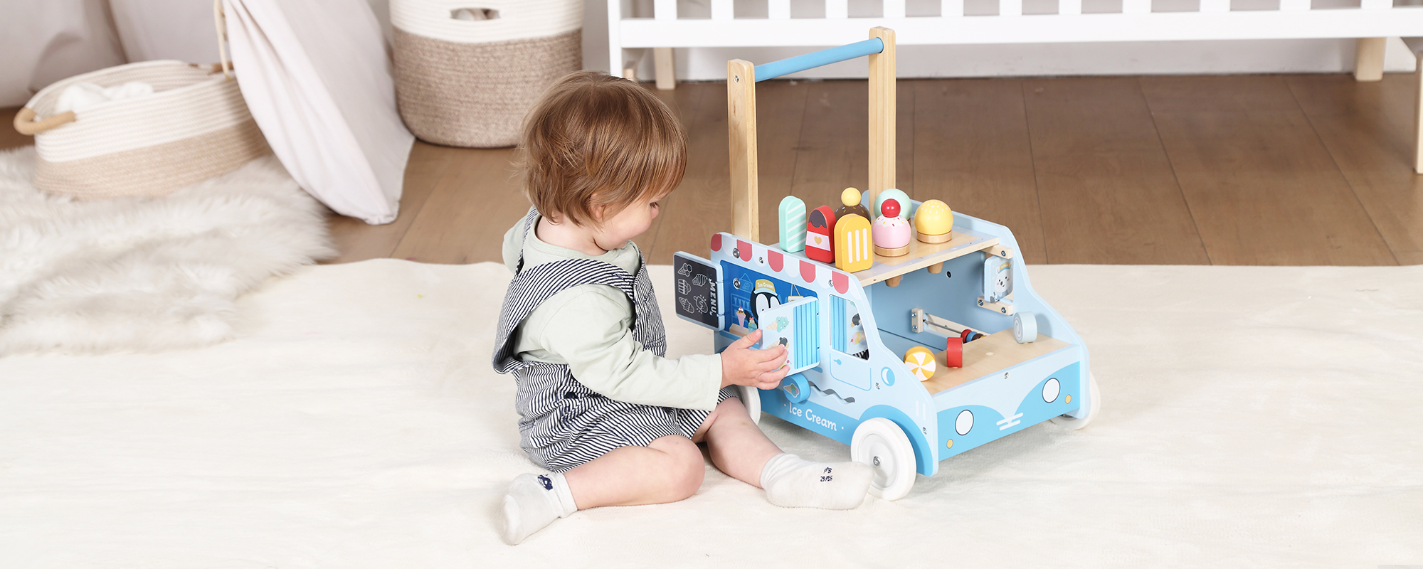 Wooden push walker with pretend play ice cream shop — treats, bead maze, and storage — for toddlers 12M+.