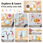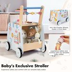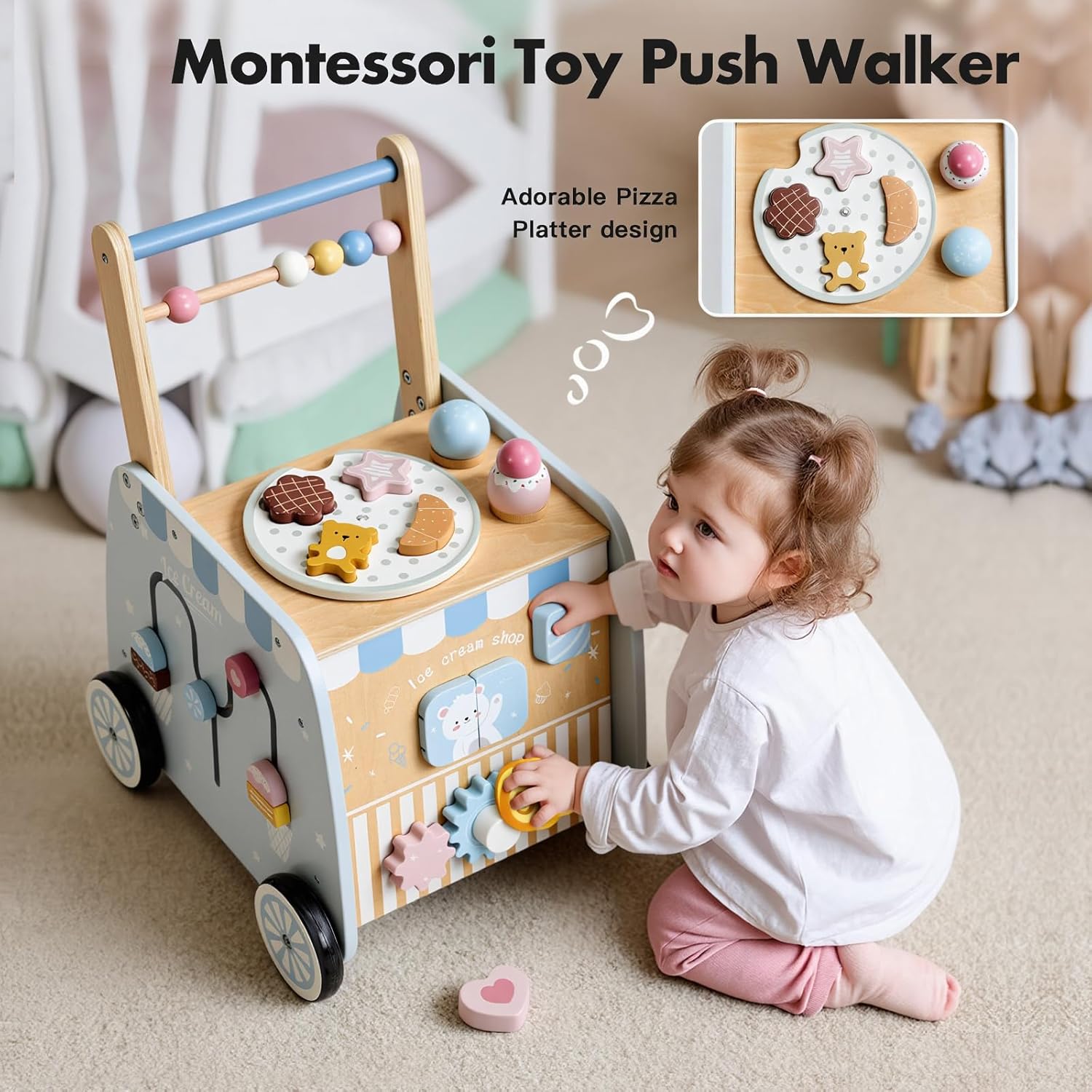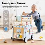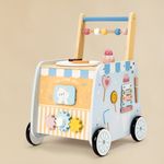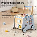 Wooden push walker with Montessori activities — shape sorter, clock, gears, and flip blocks — for toddlers 12M+.