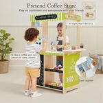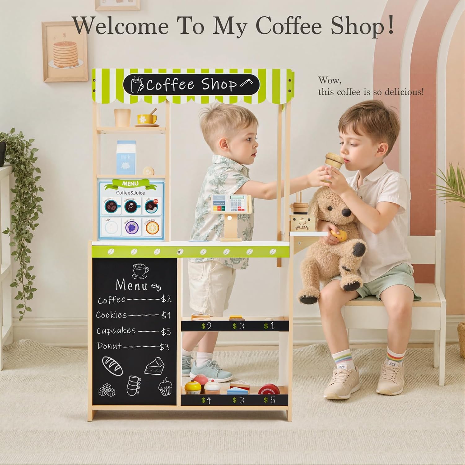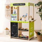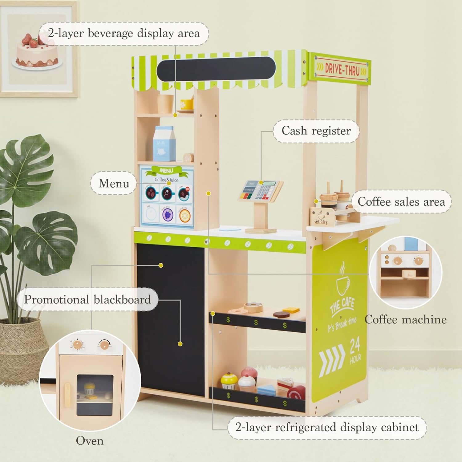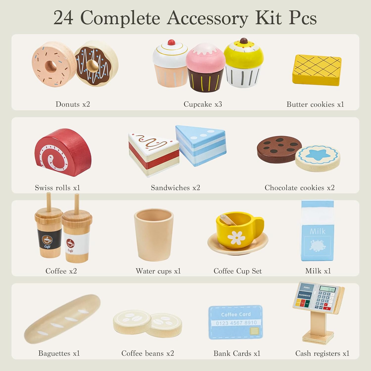 24 Pcs Pretend Play Coffee Shop, Kids Grocery Store Set, Wooden Drive-Thru Window, Coffee Maker, Oven, Cash Register, Bakery Toys Food Accessories Gift for Boys Girls 3+ Years Old