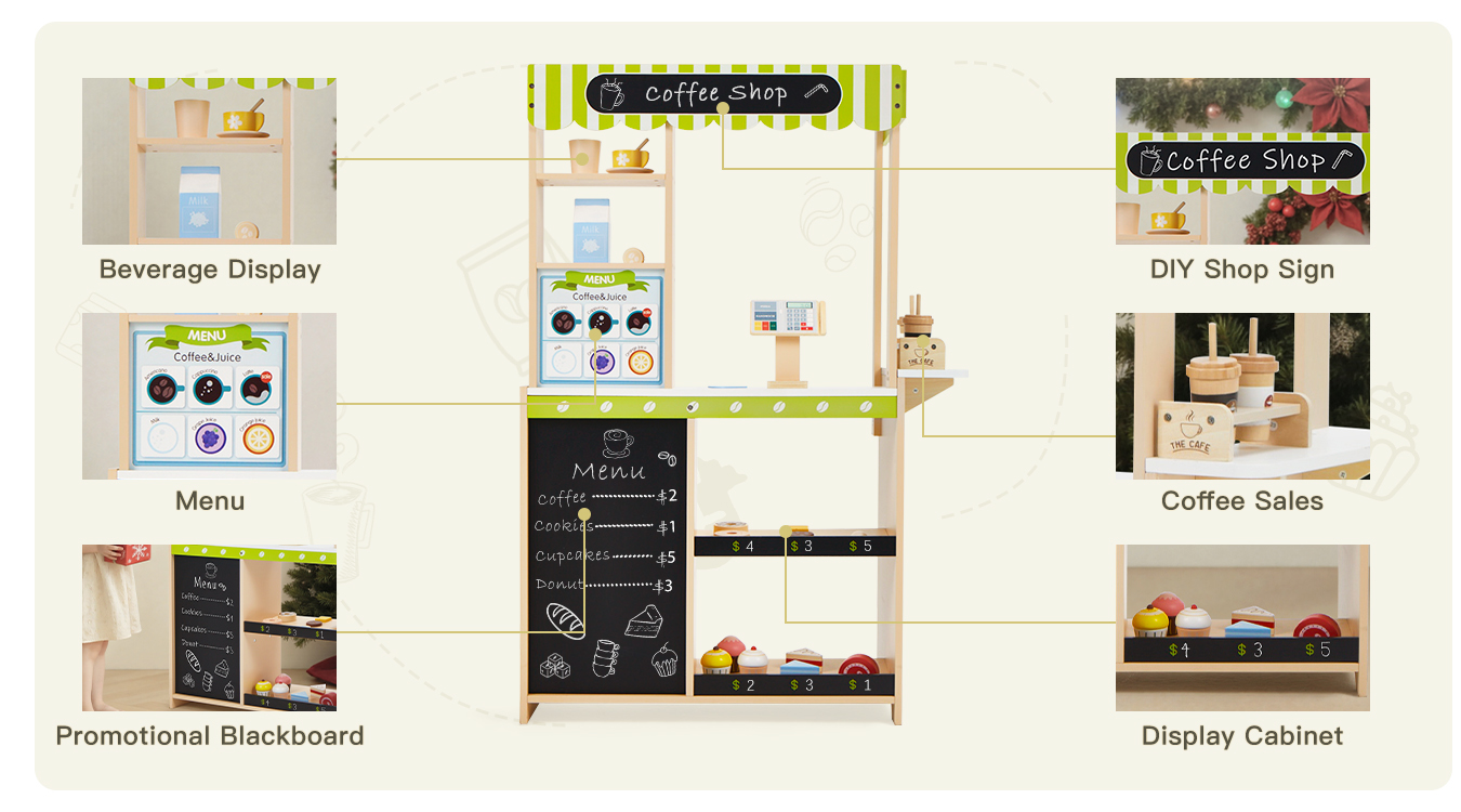 From beverage displays to price tags and menus, this café-style setup lets kids run their own shop—boosting creativity, communication, and independent play.