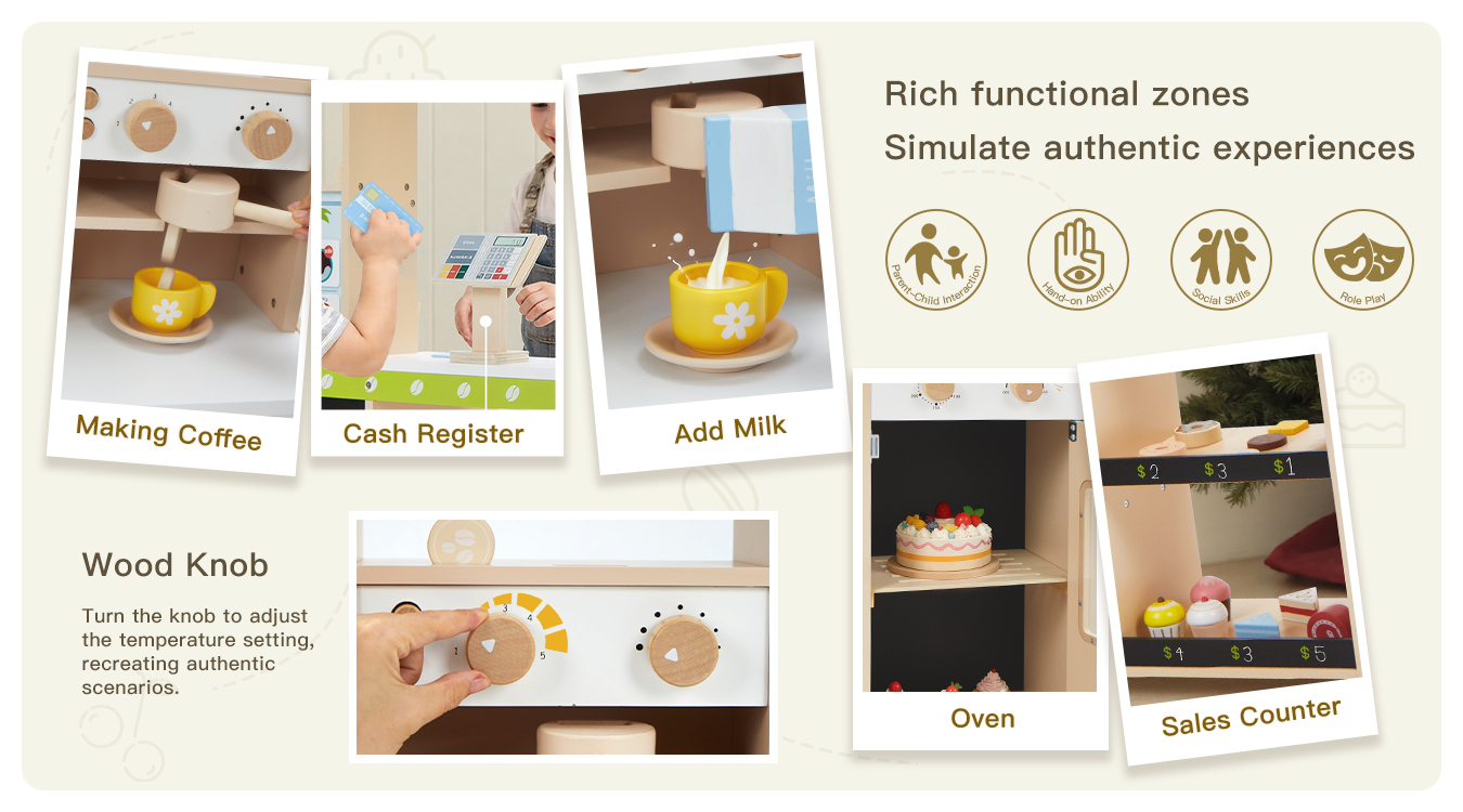 Kids brew coffee, add milk, bake treats, and ring up orders with realistic features—encouraging imaginative role play, hands-on learning, and social interaction.