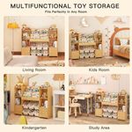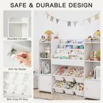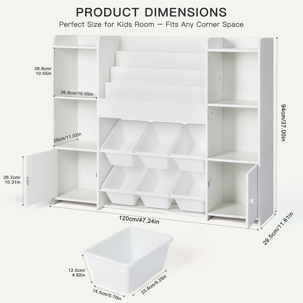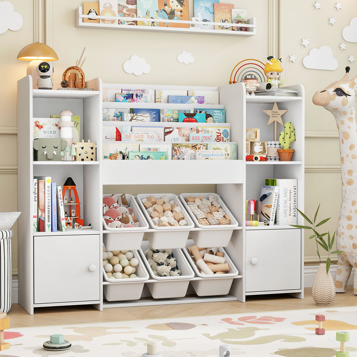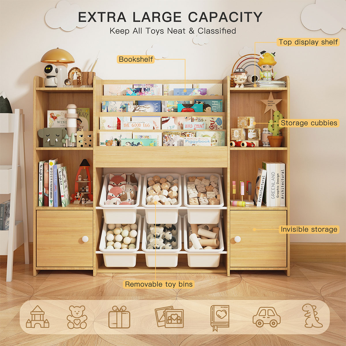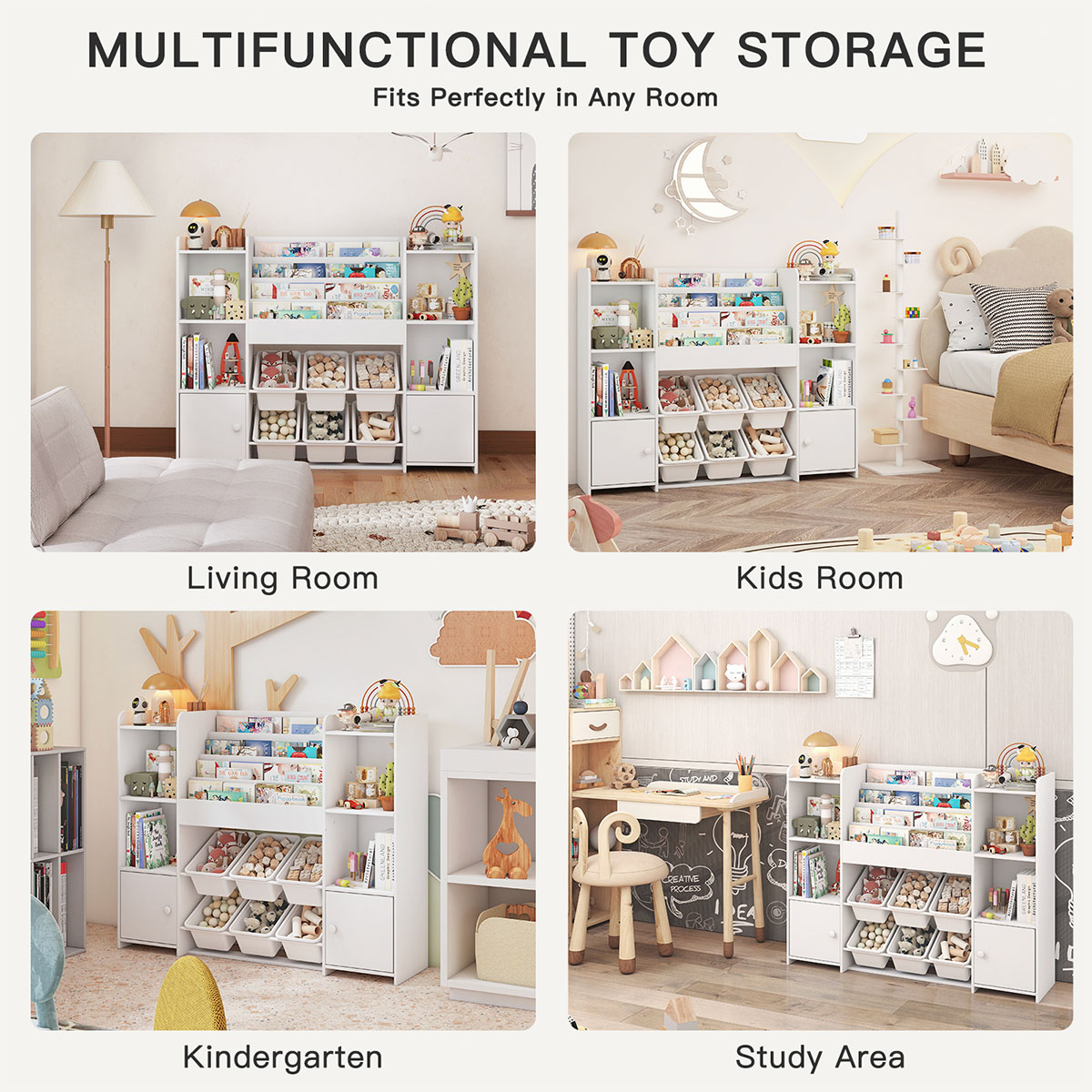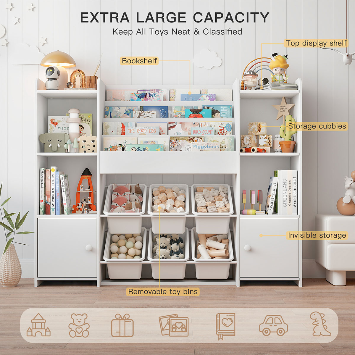 Toy storage organizer with 6 removable bins, a front-facing kids bookshelf, 4 open cubbies, 2 hidden cabinets, and a top shelf for display or daily essentials — keeps toys, books, and essentials neatly organized in living room, kids room, playroom, nursery and kindergarten.