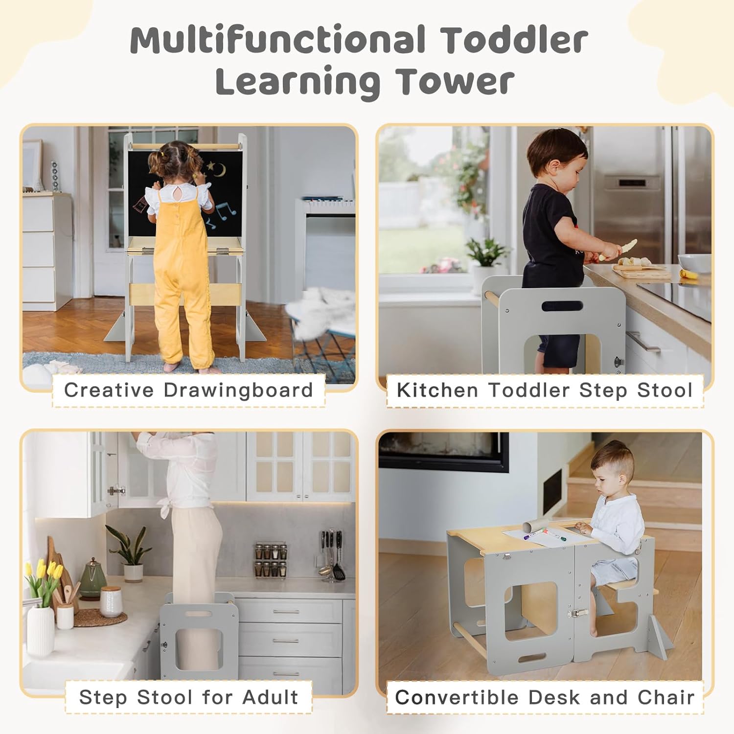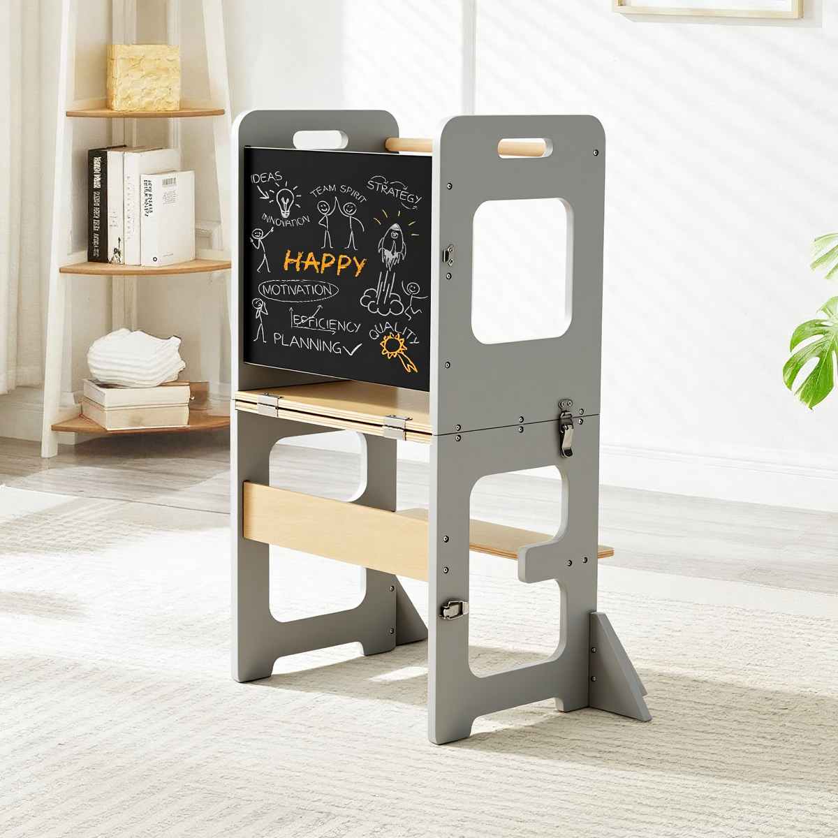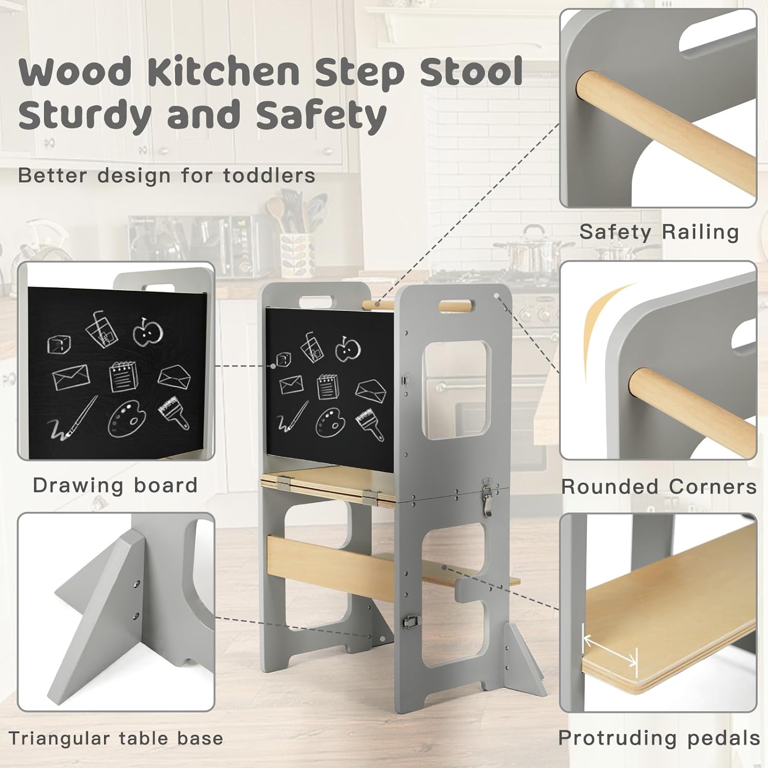 3-in-1 Kitchen Wooden Stool Helper with Chalkboard Montessori for Toddlers.