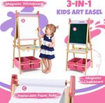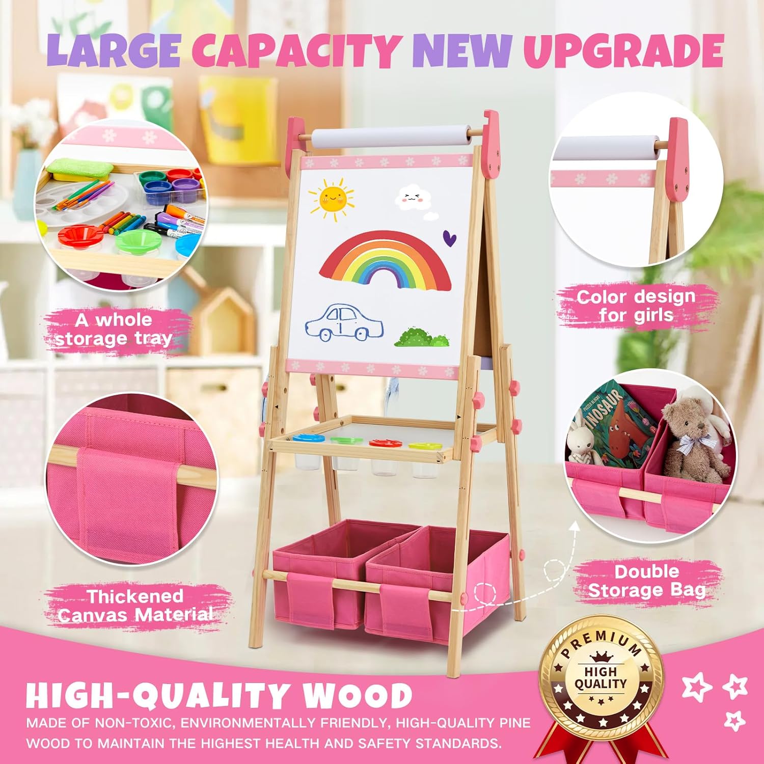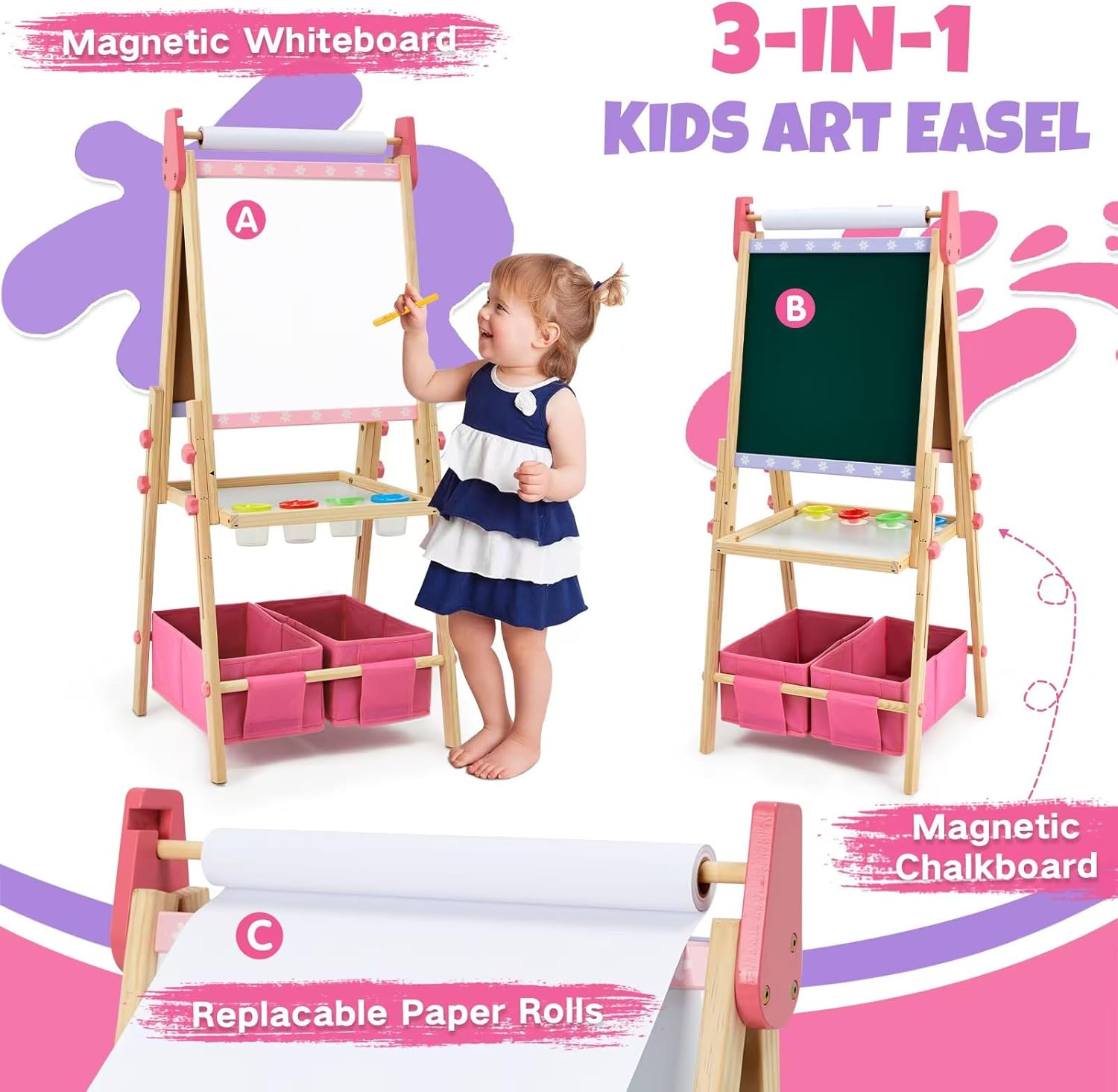 Kids Easel Including 100+ Accessories, Dual-Sided Wooden Easel for Kids Age 3-12 with Magnetic Chalk & Painting Board, Free Height Adjustable Art Easel Supplies for Toddlers (Pink)