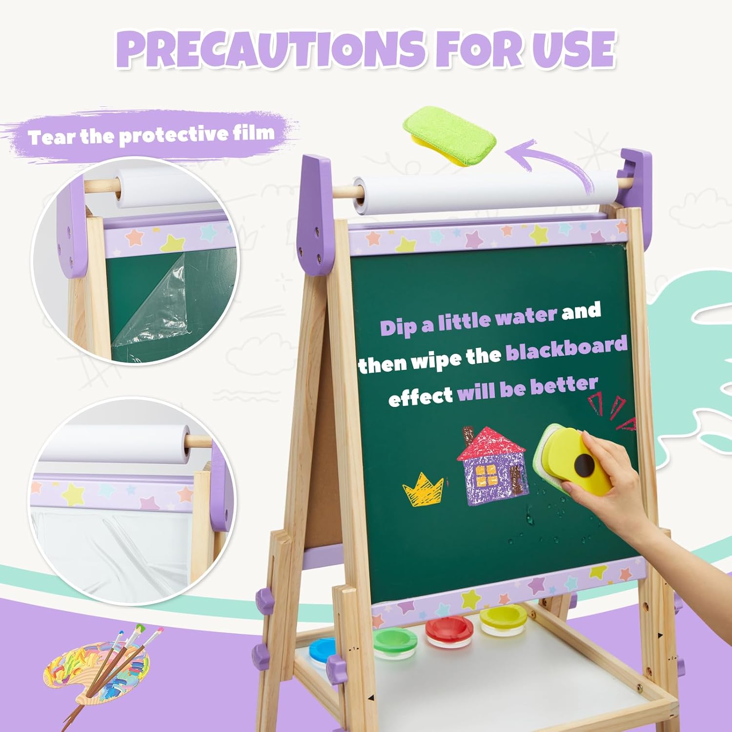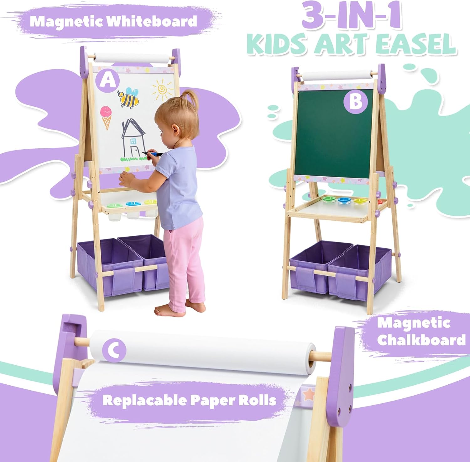 3-in-1 Kids Art Easel Set, Height Adjustable Magnetic Whiteboard & Chalkboard with Painting Paper Roll, Wooden Dual-Sided Art Station for Toddlers & Children Ages 3-8