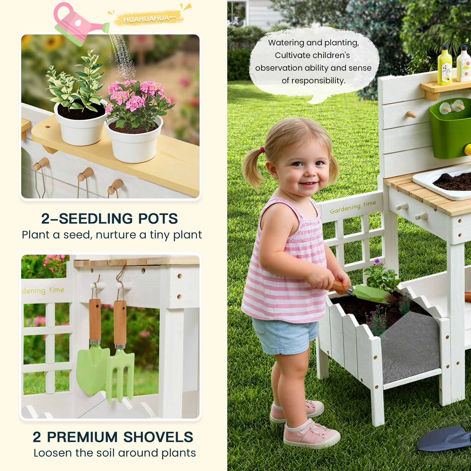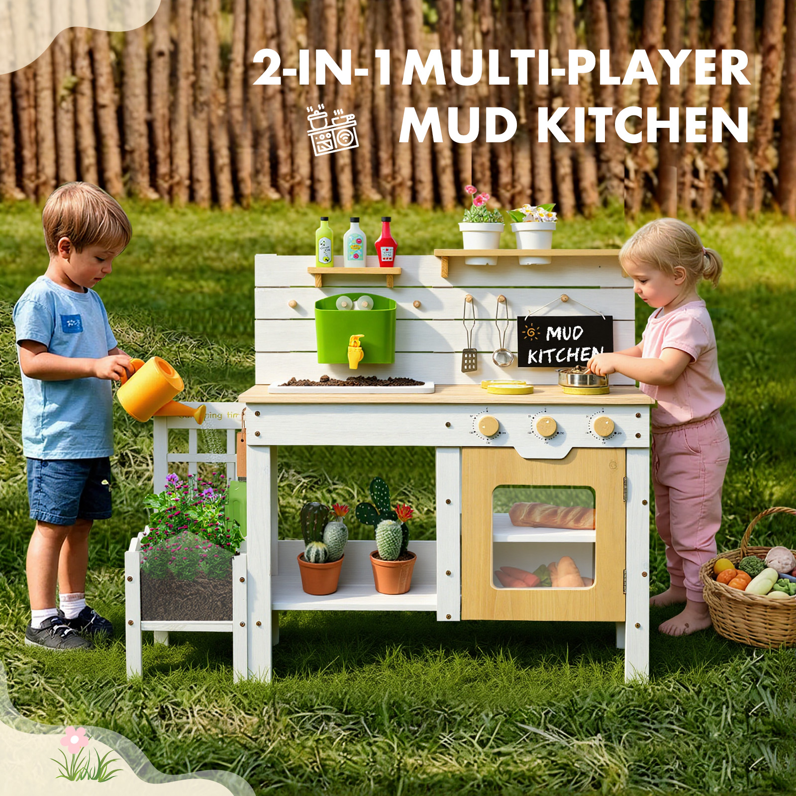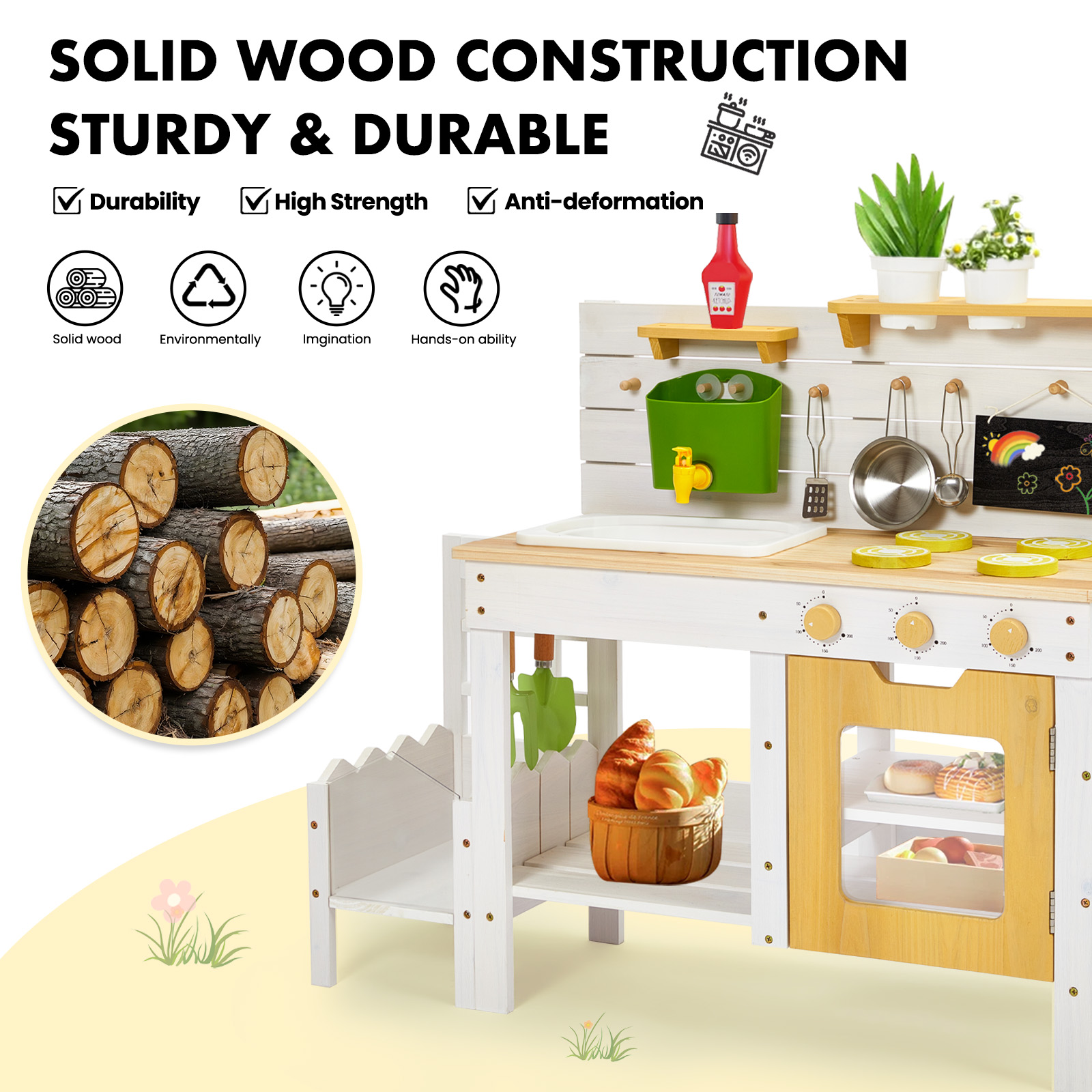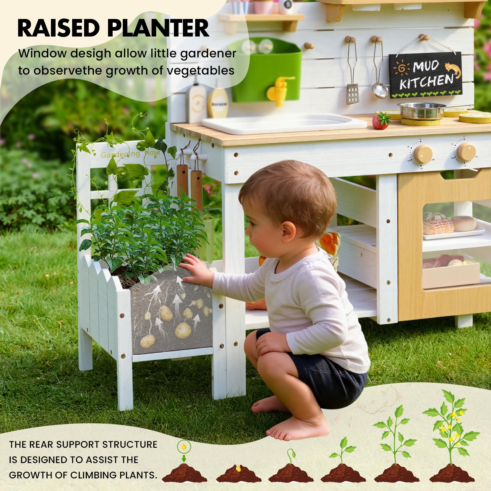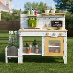 Wooden Play Kitchen with Plant Growing Box & Trellis, Real Faucet Sink, Gardening Tools &, Cooking Accessories, Ideal for Toddlers Ages 3+
