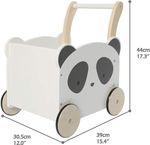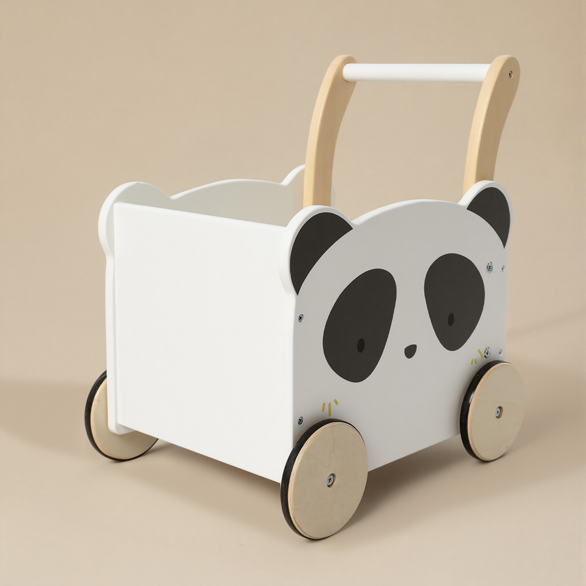 Solid-wood panda walker with smooth wheels, built-in storage, refined design, and certified safety for confident first steps.
