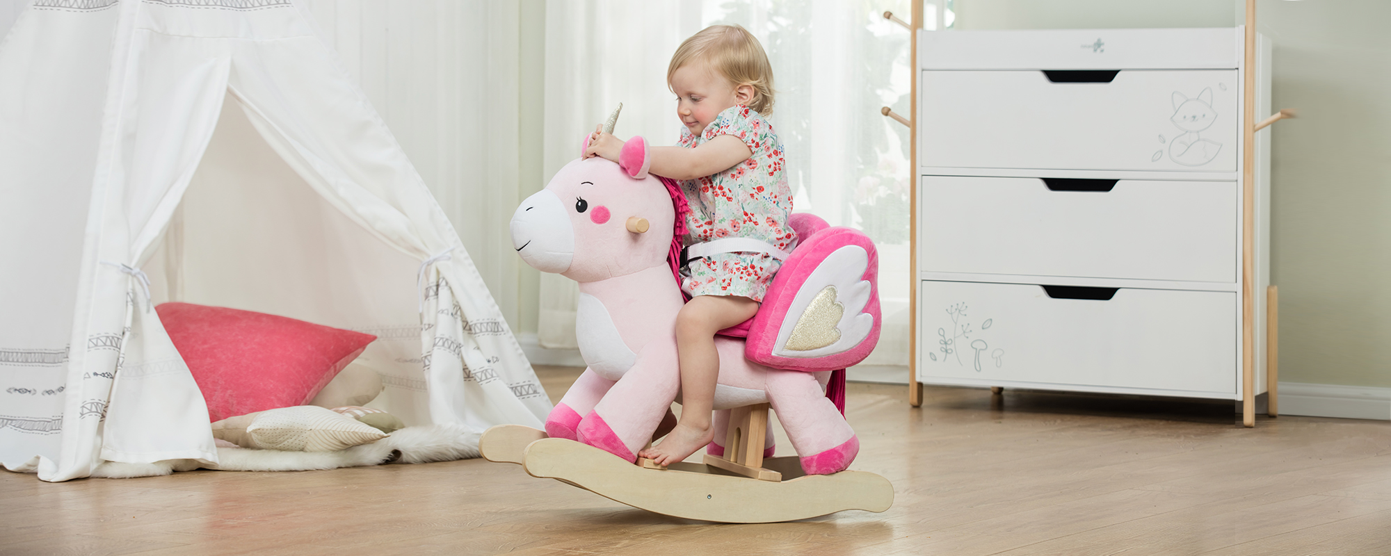 Plush pink unicorn rocker with silver horn and mane — soft cushioned seat with harness, sturdy wooden base, and gentle rocking fun for kids 1–3Y.
