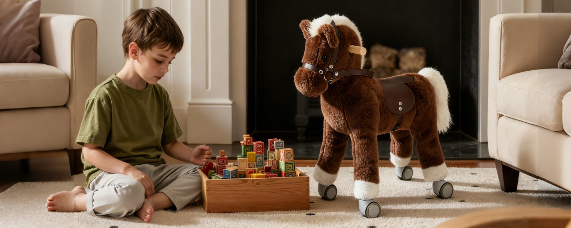 Plush pony ride-on toy with a lifelike horse design — soft faux rabbit fur, wooden frame, and realistic forward-gliding movement for toddlers 24M+.
