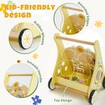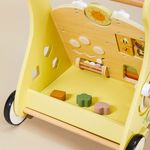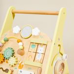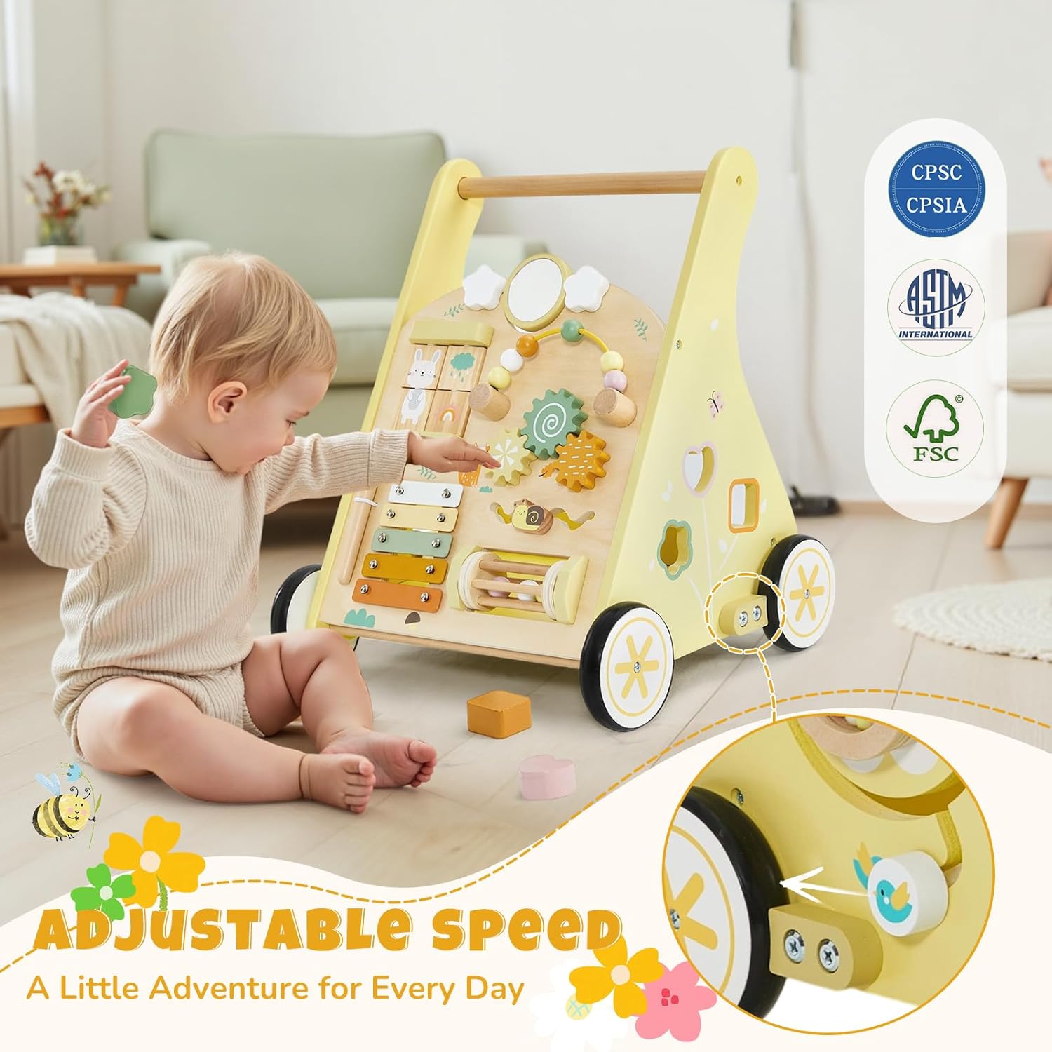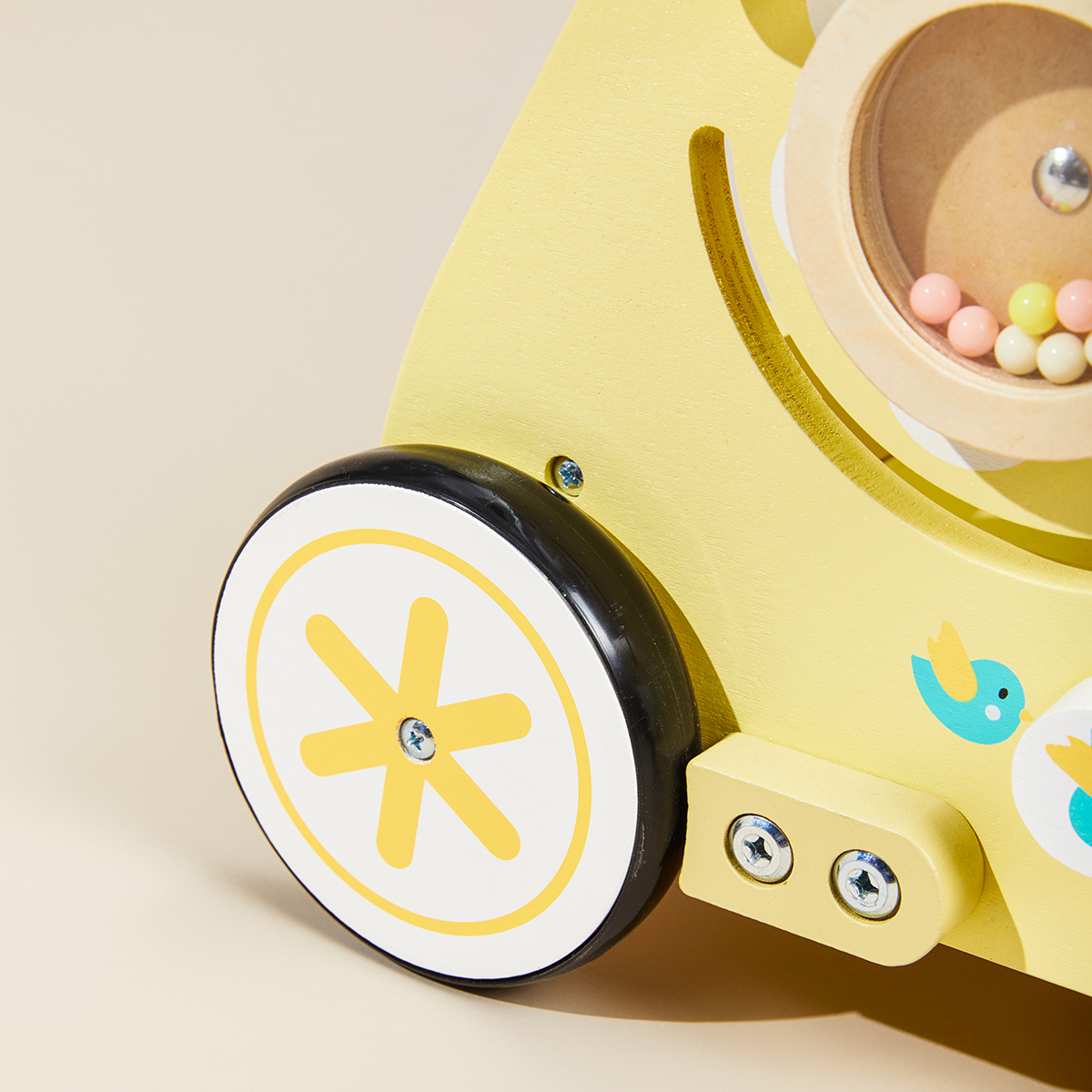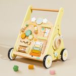 Wooden push walker with various Montessori activities and vibrant yellow color — for toddlers 12M+.