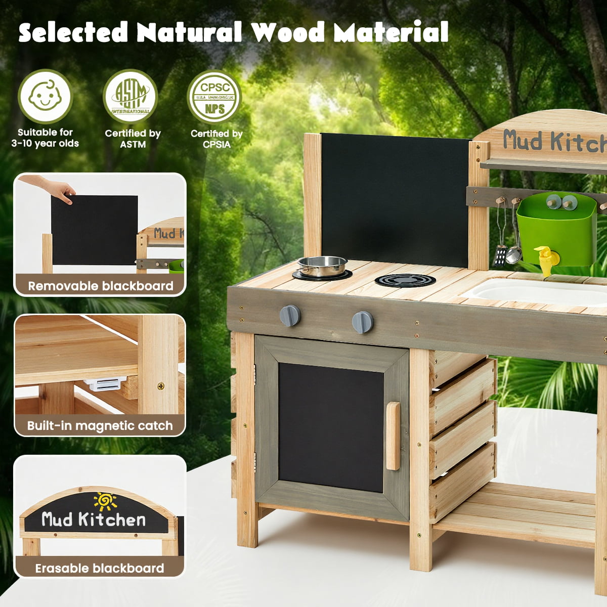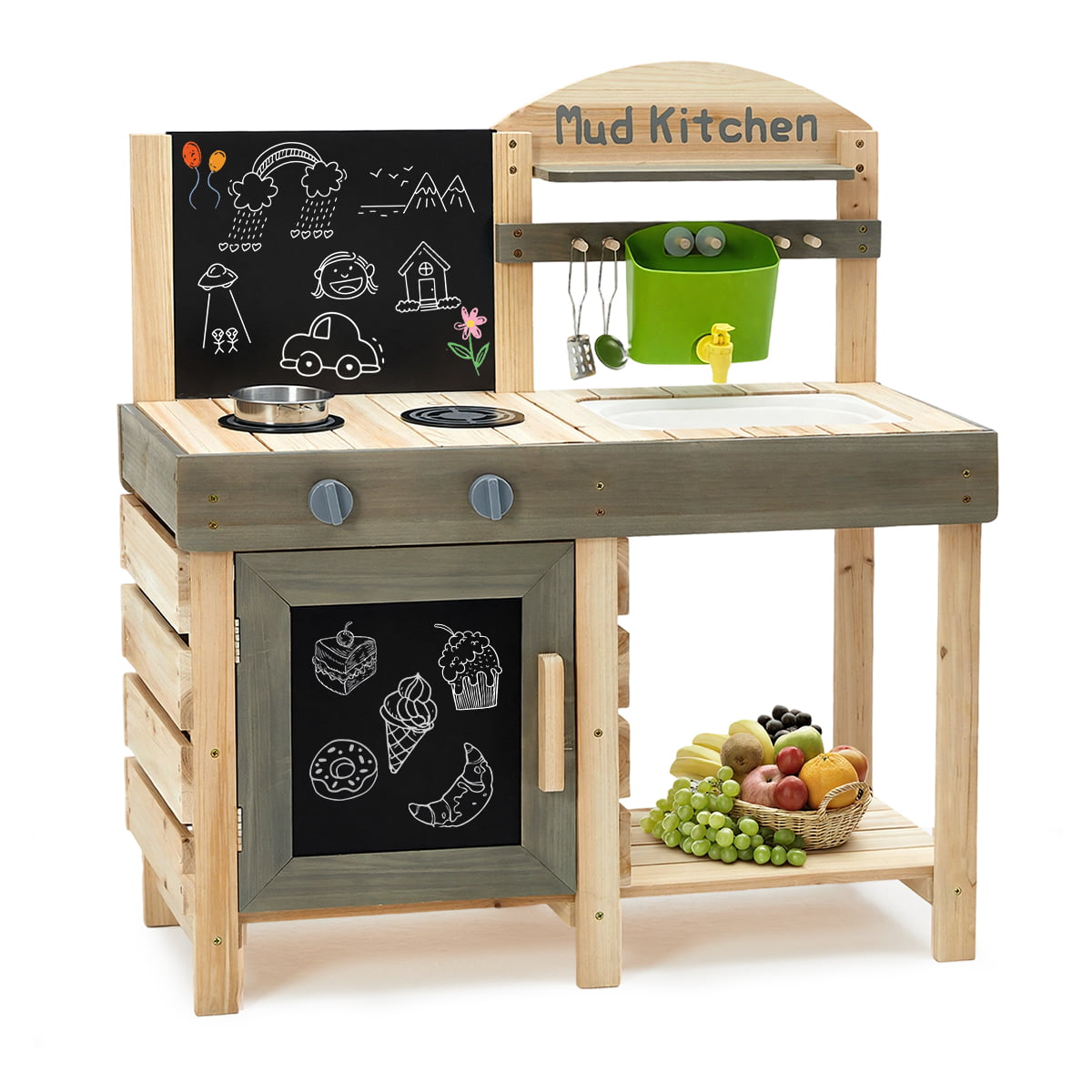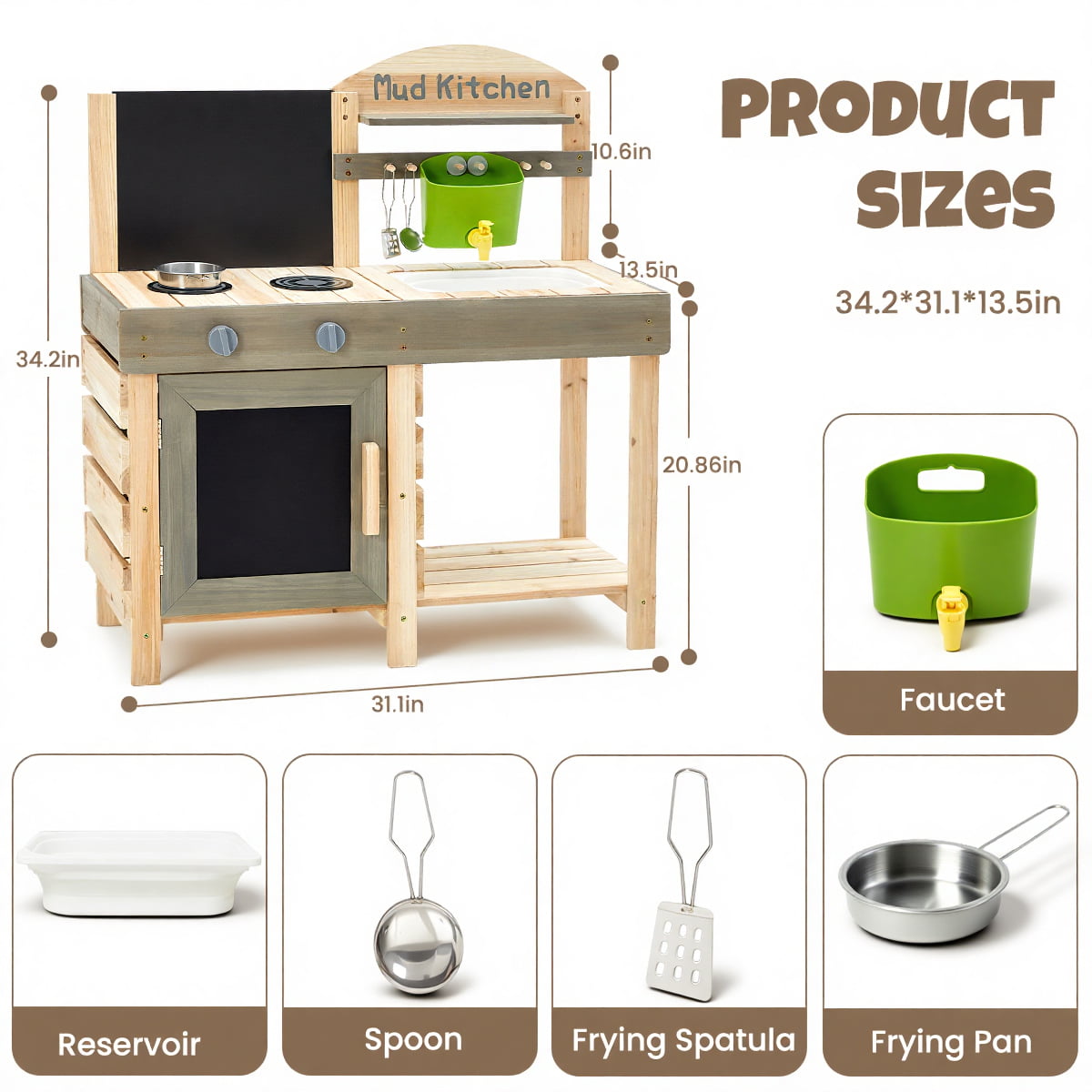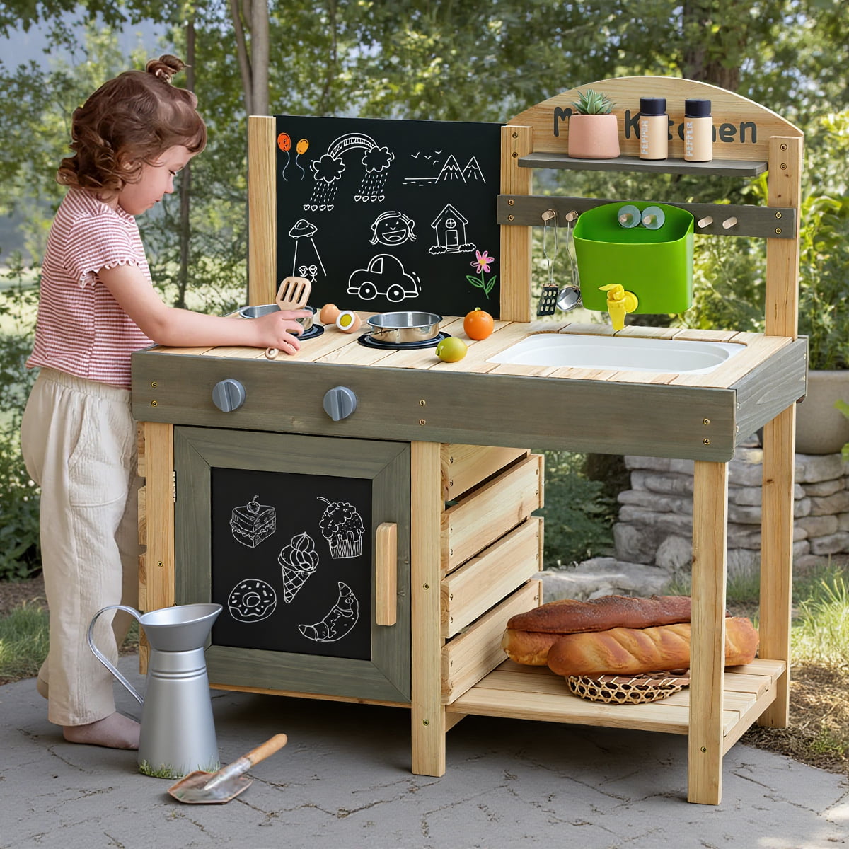 Outdoor wooden mud kitchen with faucet, sink, and stoves — sparks imagination, pretend cooking, and water fun for kids 3Y+.