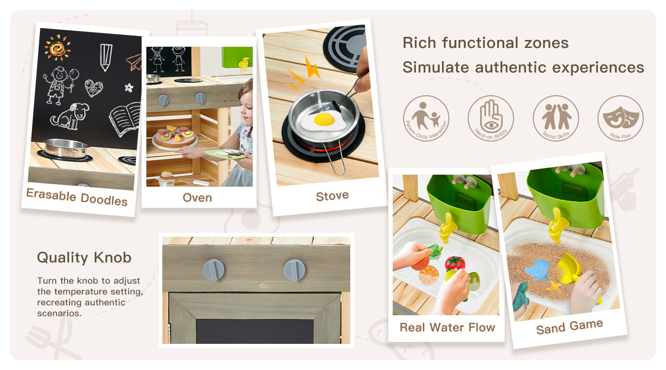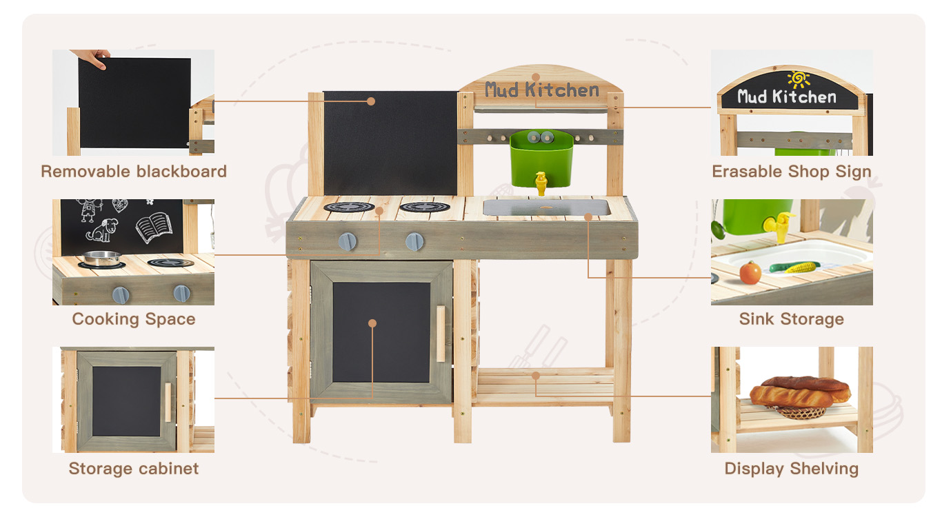 This wooden mud kitchen turns everyday play into meaningful learning. Children cook, wash, draw, and explore textures through hands-on activities—strengthening fine motor skills, sensory awareness, creativity, and early problem-solving in true Montessori-style play.