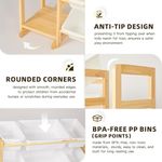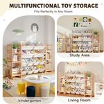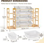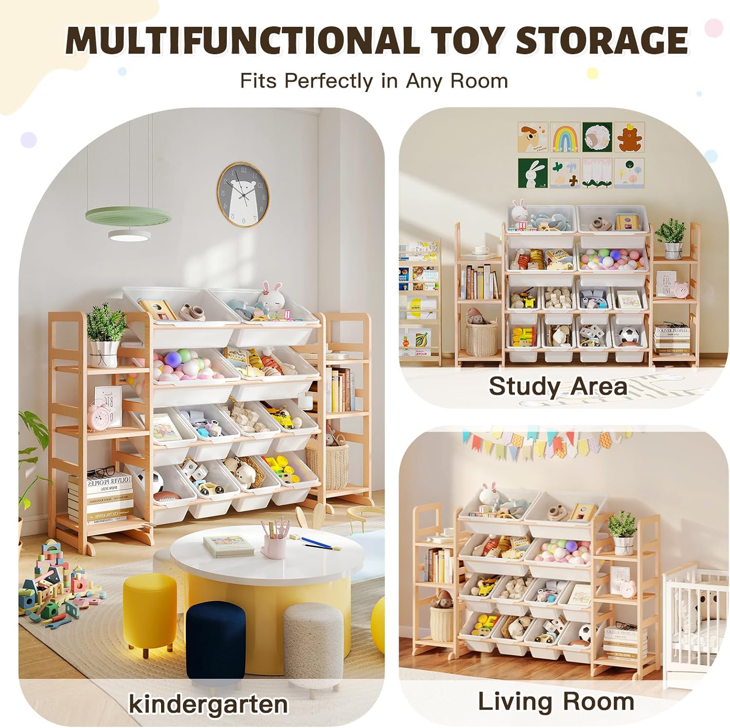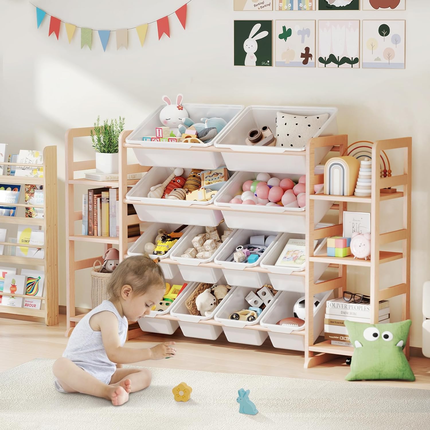 Wooden organizer with 6 open display shelves and 12 detachable plastic bins – keeps toys, books, and essentials neatly organized in living room, kids room, playroom.